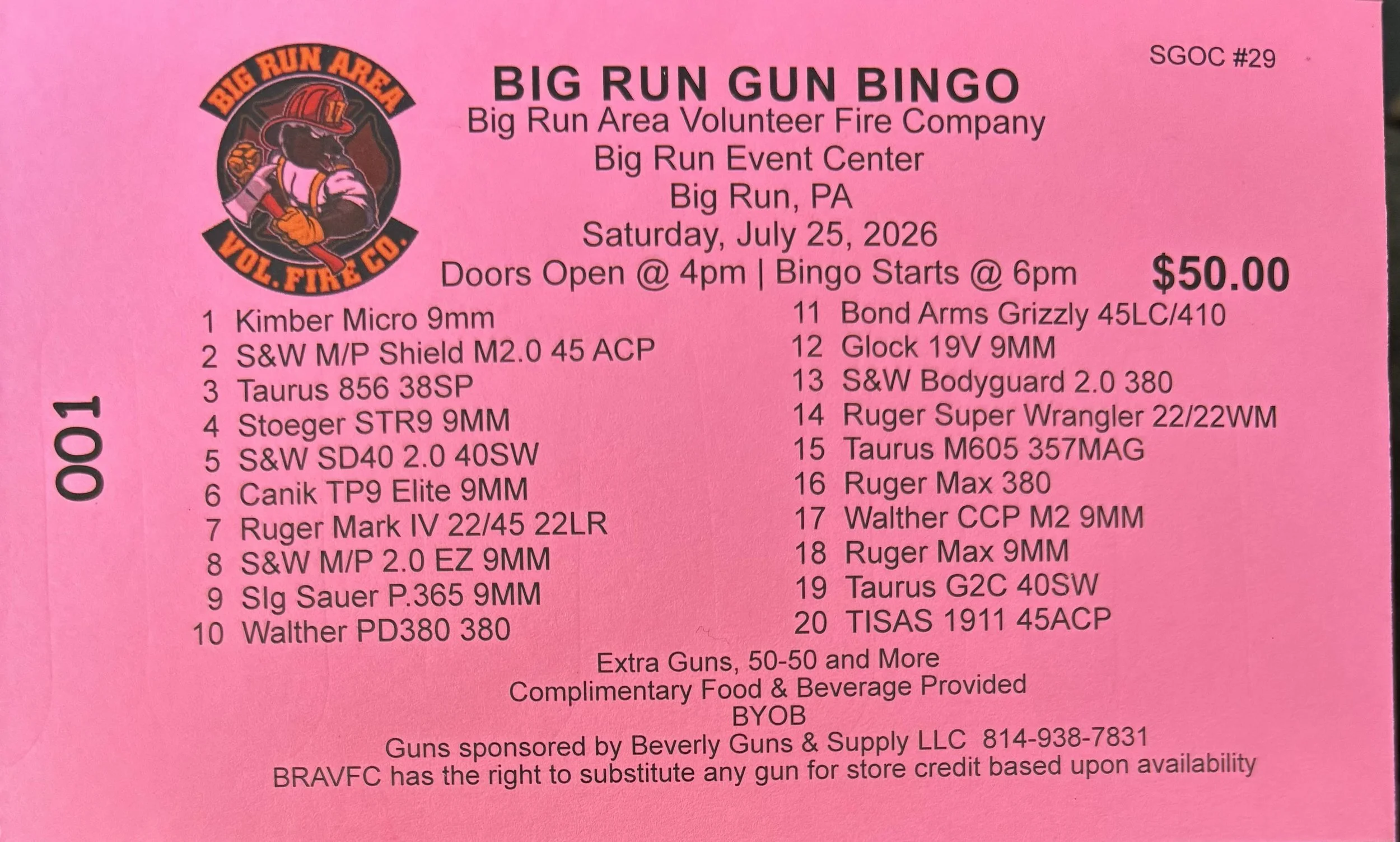 Saturday, July 25, 2026 at 6pm - our first handgun BINGO. Doors open at 4pm and BINGO starts at 6pm. Extra guns, 50/50, and more.